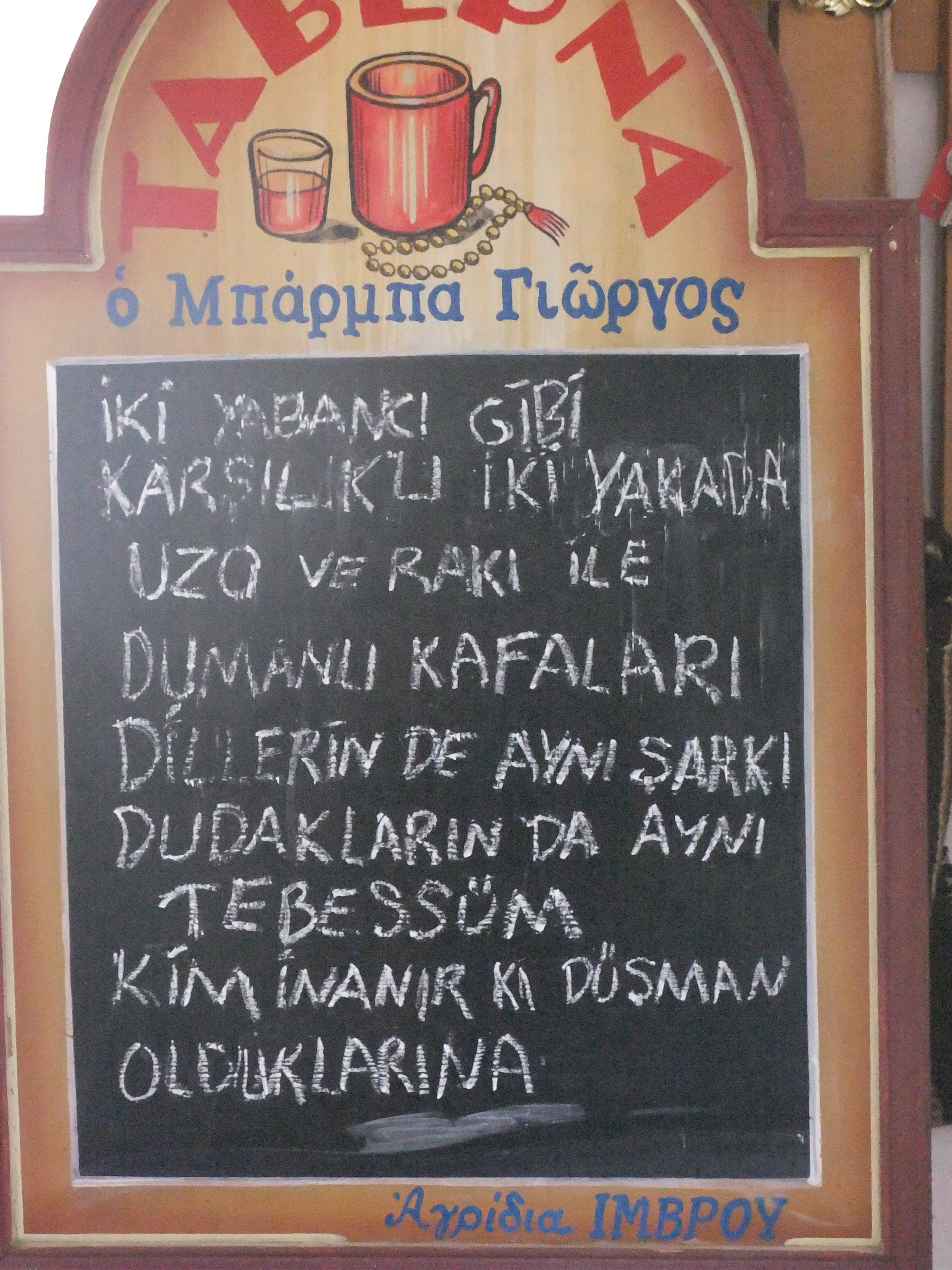 Hristo’nun Kahvesi’ni ardımızda bırakıp dar bir yoldan Bademli’ye vardık. Eski evlerin arasında ilerleyip çamaşırhanenin bulunduğu bölgeye geldik. Oradaki nefis çınar ağacının gölgesinden tavuklar ve koyunlar faydalanıyordu. Zaten tüm köylerde bağımsızca dolaşan koyunları keçileri görmek mümkün. Adanın oğlağı meşhur, nefis dağ otlarını yiyen oğlakların tadı bir başka oluyordur, biz de bu lezzetten mahrum kalmayalım diyerek Son Vapur adlı restoranının sahibi Arek’in eşine akşam için oğlağımızı sipariş ettik. Bademli’de karşımıza çıkan İmbros Otel ‘in manzarasına ve terasına hayran kalarak burada konaklamaya karar verdik. İsabetli bir karar olmuş, kahvaltısı da bizi hayal kırıklığına uğratmadı. Ev yapımı börek ve kekleri “tatilde yenilenler sayılmaz” kapsamında midemize indirdik 🙂
